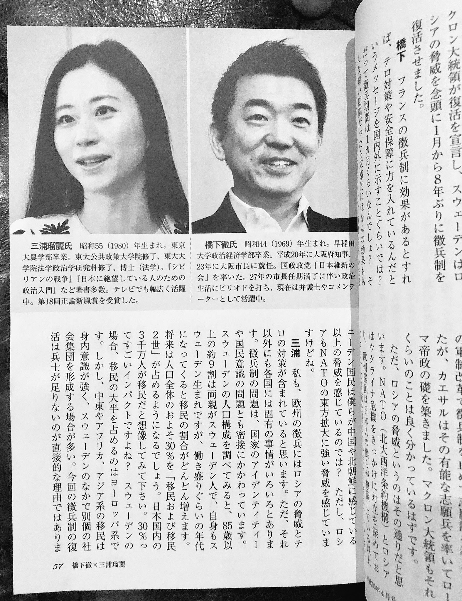 三浦瑠麗 Lully Miura 本日発売の月刊 正論 における橋下徹さんとの対談ですが 編集部がつけた煽りめのタイトル とは対照的に落ち着いた対談となっています 入り口は欧州で復活しつつある徴兵制の見方ですが 政軍関係の考え方 自衛隊の憲法における